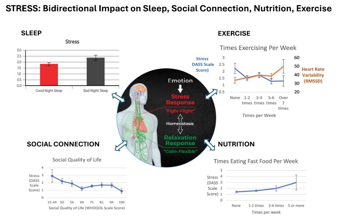 2. Stress and Resilience. Stress is related to a wide variety of metrics in the database, including Sleep, Exercise, Heart Rate Variability, Nutrition, and Social Connectedness. The database includes not only self-report measures of Resilience, but many of the underlying factors — biological stress-recovery metrics, cognitive flexibility, objective metrics of emotional response and regulation (at conscious and subconscious levels), positivity bias, and social support.