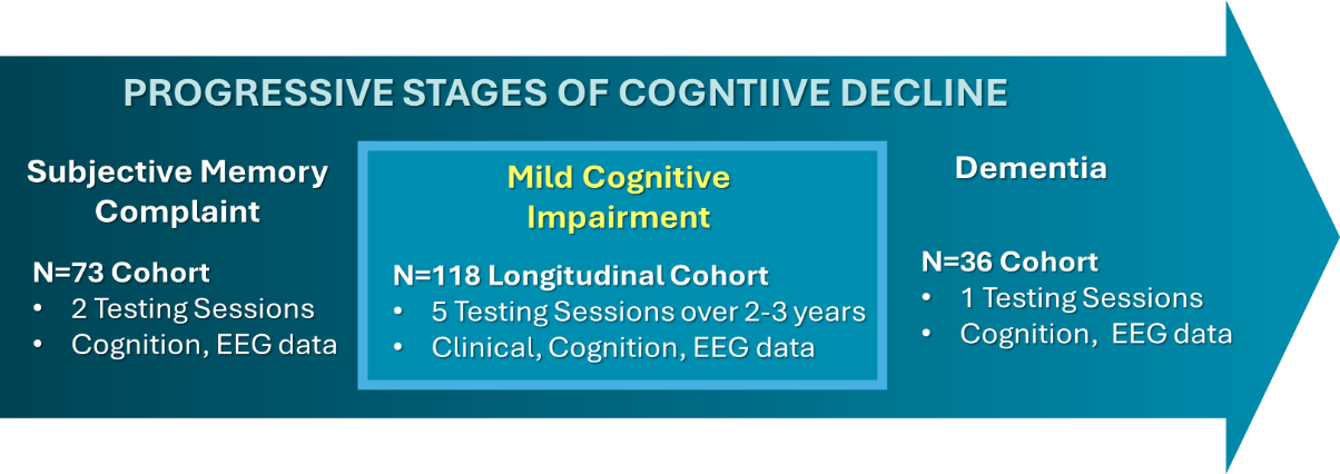 The Traumatic Brain Injury (TBI) group contains N = 343, with cognition and psychophysiology assessments, including resting EEG as well as EEG during several cognitive tasks. This cohort provides an unprecedented opportunity to compare common and unique elements of cognitive performance and underlying neural substrates between TBI, SMC, and MCI populations — all tested on the same standardized batteries.