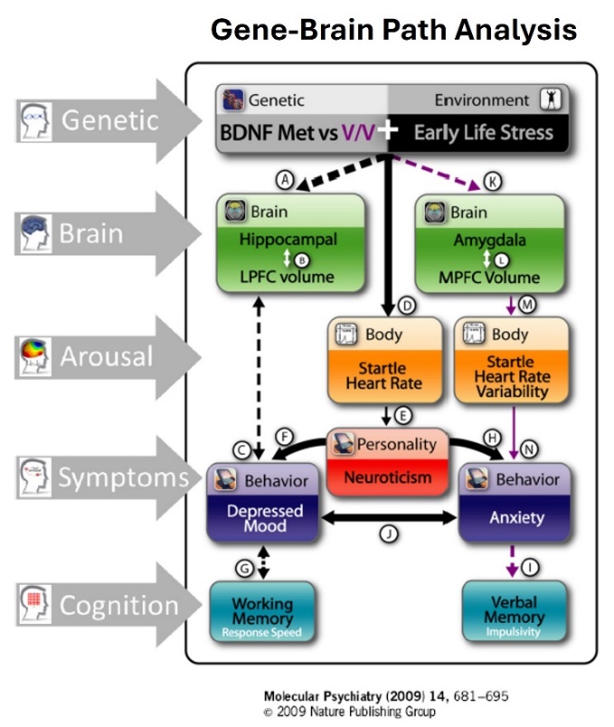 1. Gene–Environment Interaction Pathways to Mental Health. Path analysis modelling with part of this dataset has elucidated how genetic BDNF variants interact with experienced childhood trauma such that childhood trauma leads to adult Anxiety via amygdala-MPFC emotional brain networks, and to both Anxiety and Depression in met allele carriers via Cognitive Hippocampal-LPFC brain networks.