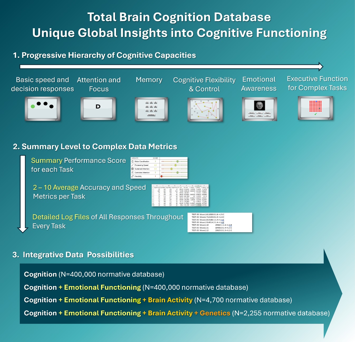 The assessments and data metrics in the Total Brain International Database have been designed to capture the core processing elements along the spectrum of brain processes, following a continuum from non-conscious through to conscious and long-term self-regulation processes. The metrics provide an integrative framework both across this continuum and across levels of function (genetic, imaging, functional brain-body dynamics, cognitive performance, and self-report).
